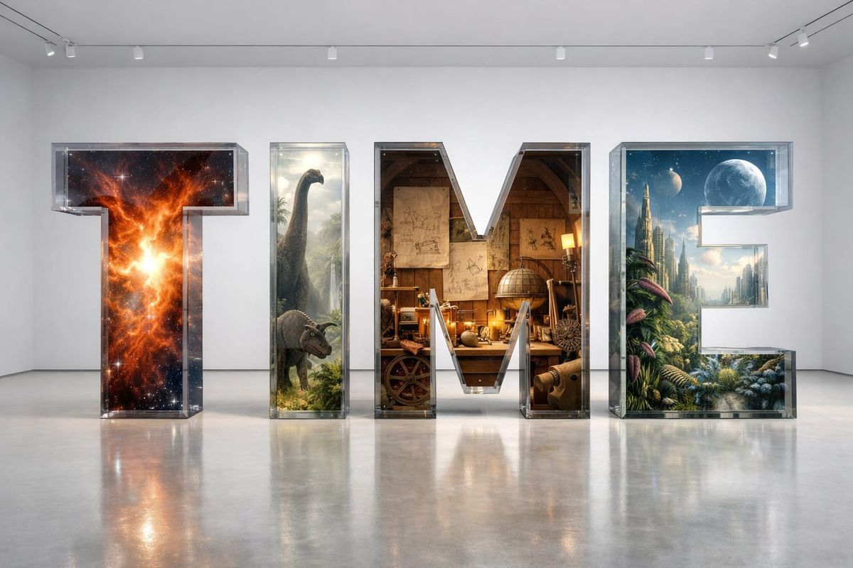 This hyper-realistic image showcases transparent letters spelling TIME, each a portal to a different epoch from star birth to dinosaurs and future alien worlds.