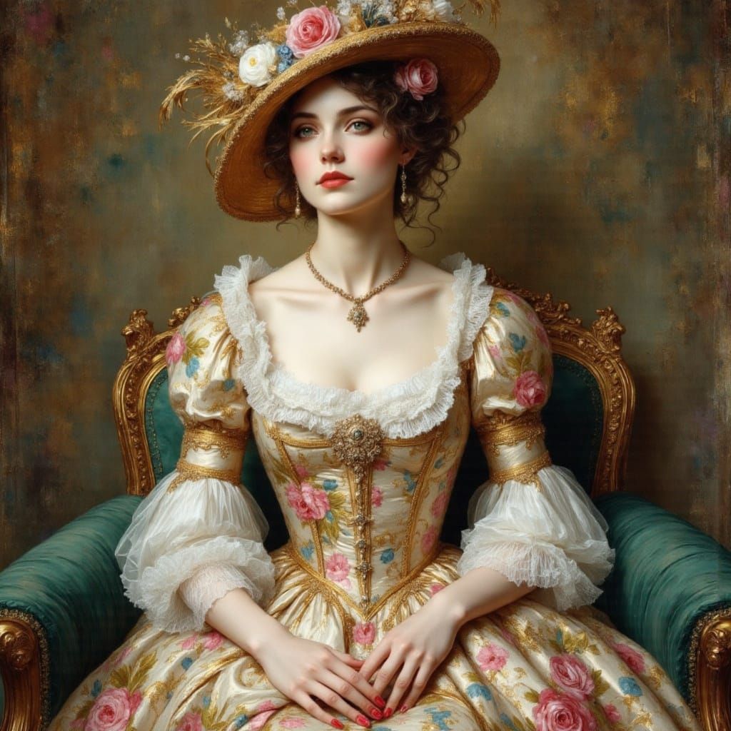 This image shows a woman in a formal chintz gown, evocative of the Victorian era. The portrait features soft, earthy tones and a luxurious, detailed aesthetic.