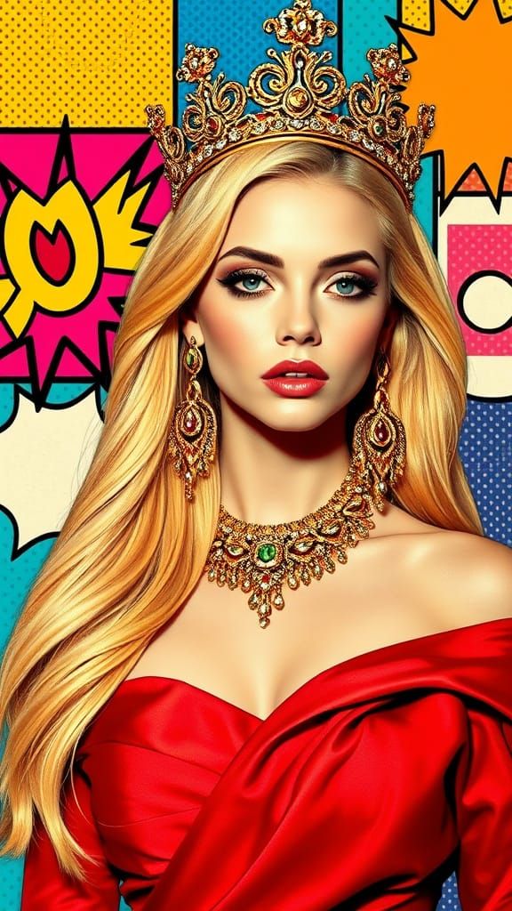 A striking picture of a beautiful blonde woman adorned with royal gold jewelry and a luxurious gown. This pop art style image features bold comic book panels and hyper-realistic details.