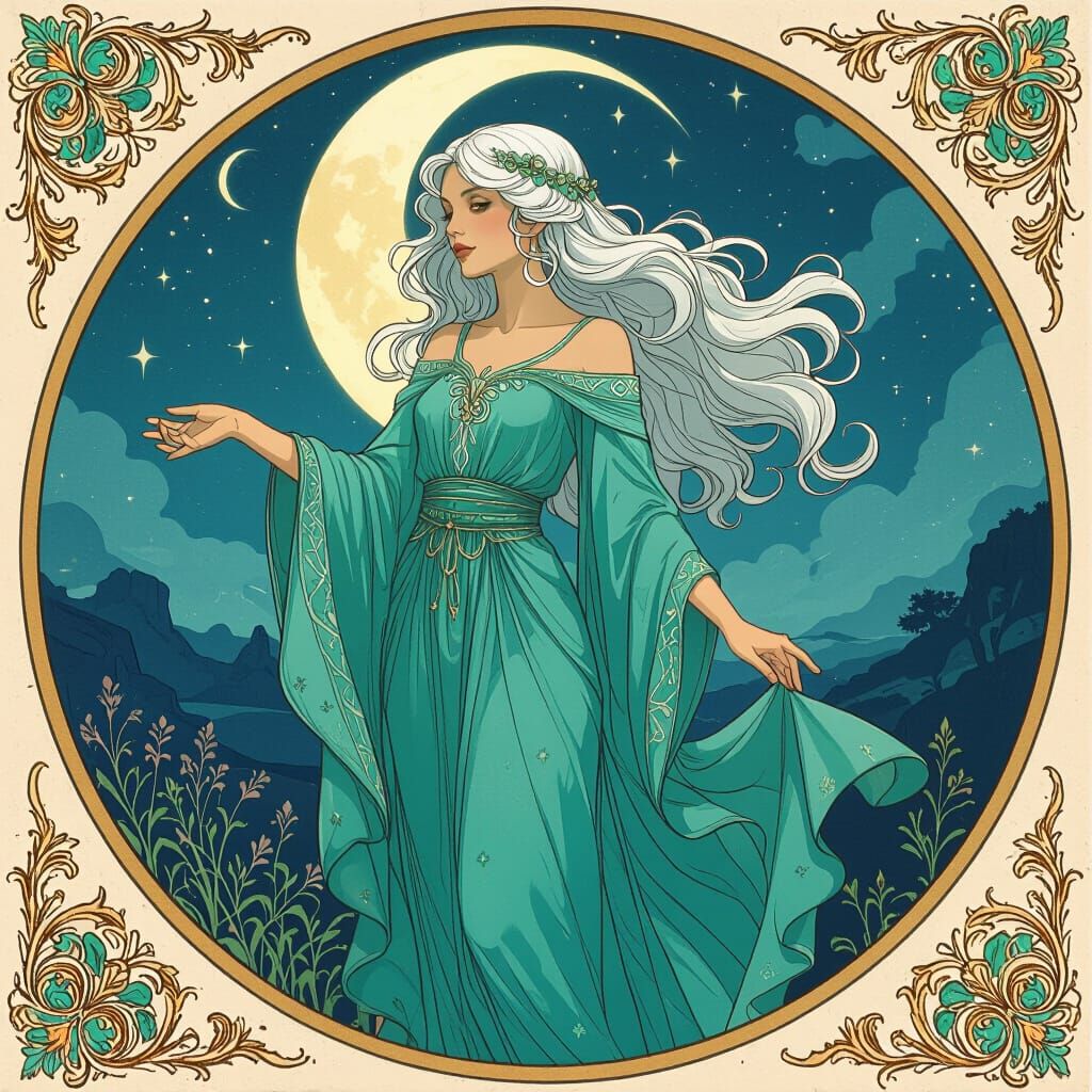 A magical image of a fairy in turquoise robes with flowing silver hair under a dreamy night sky. The artwork features ethereal elegance with vibrant colors, as a digital illustration.