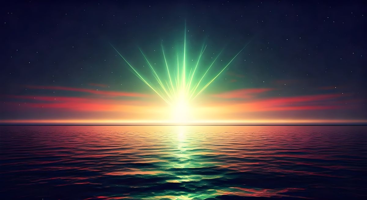 A highly detailed cinematic art style collision of square-shaped galaxies with vibrant hues of green, red, and yellow mirrors precisely onto a calm sea at night, creating a mesmerizing interplay of light and shadow. The water shimmers under a god-like illumination, enhanced by soft bokeh that adds to ...