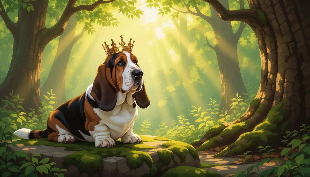 A noble Basset Hound wearing a gold crown sits on a stone in a sun-dappled forest. This hyper-realistic oil painting features dramatic lighting and rich colors, creating a majestic portrait.