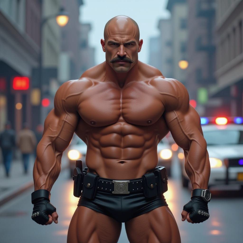 This image shows a bald, muscular gay bodybuilder cop with a moustache, in a leather jockstrap, arresting a suspect. Features dramatic lighting and a hyperrealistic digital art style.