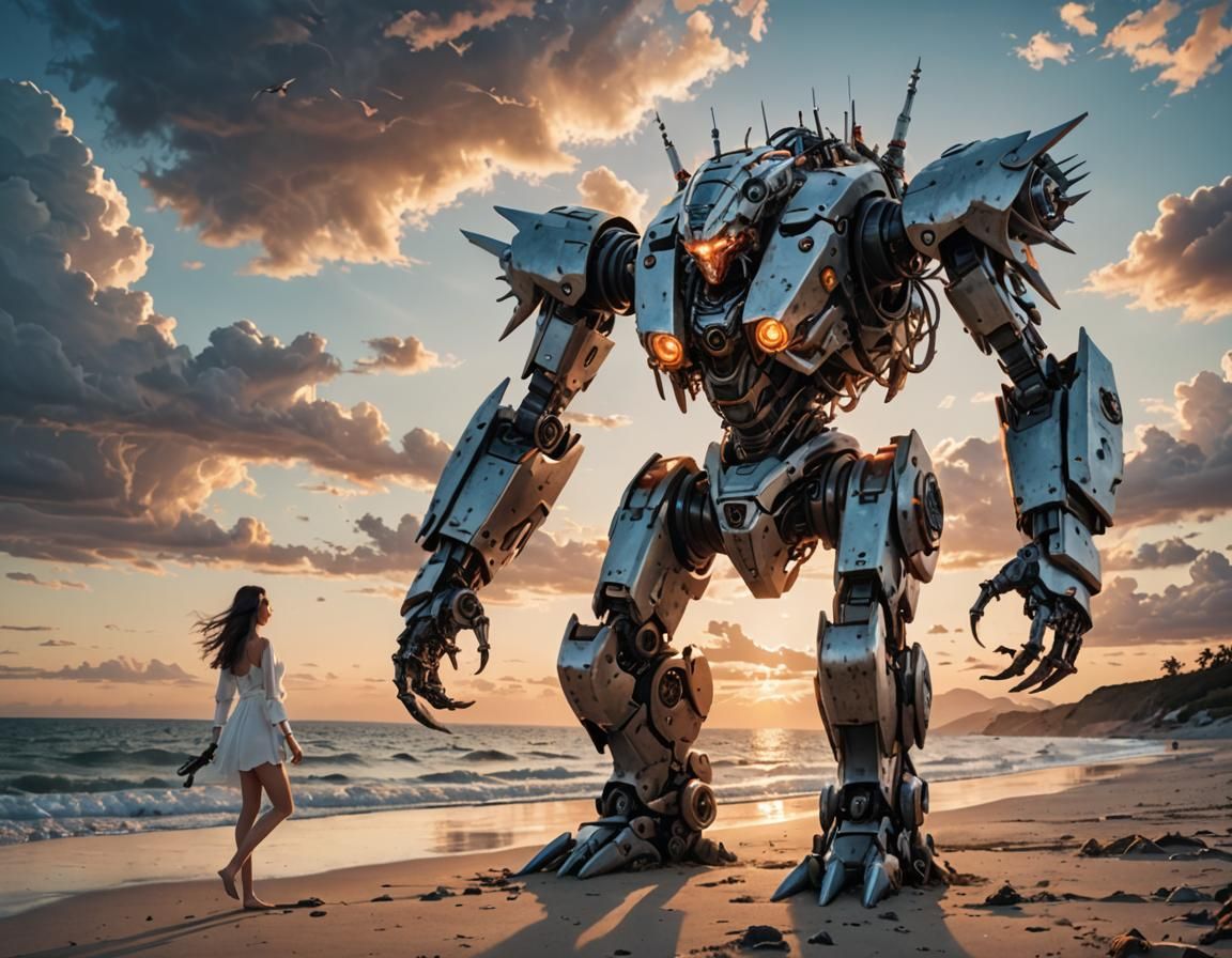 This image shows a six-legged robot monster with various weapons and the face of a woman on a peaceful beach at sunset. The clouds and ocean horizon enhance the setting.