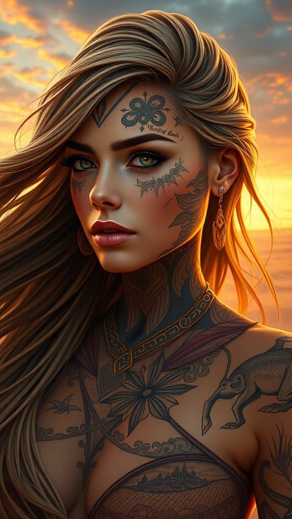 A hyperrealistic image of a beautiful supervillain known as "The Sandstorm." She has long, flowing hair, intricate tattoos, and stands amidst a swirling sandstorm under a twilight sky, in a fantasy aesthetic.