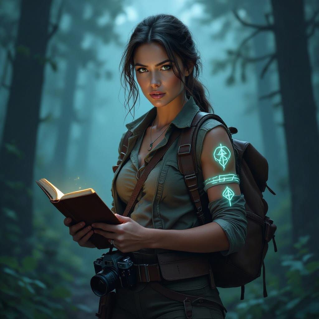 A striking picture of a determined woman explorer in a dark forest, with glowing glyphs on her forearms. The image blends mystical realism with cinematic lighting.