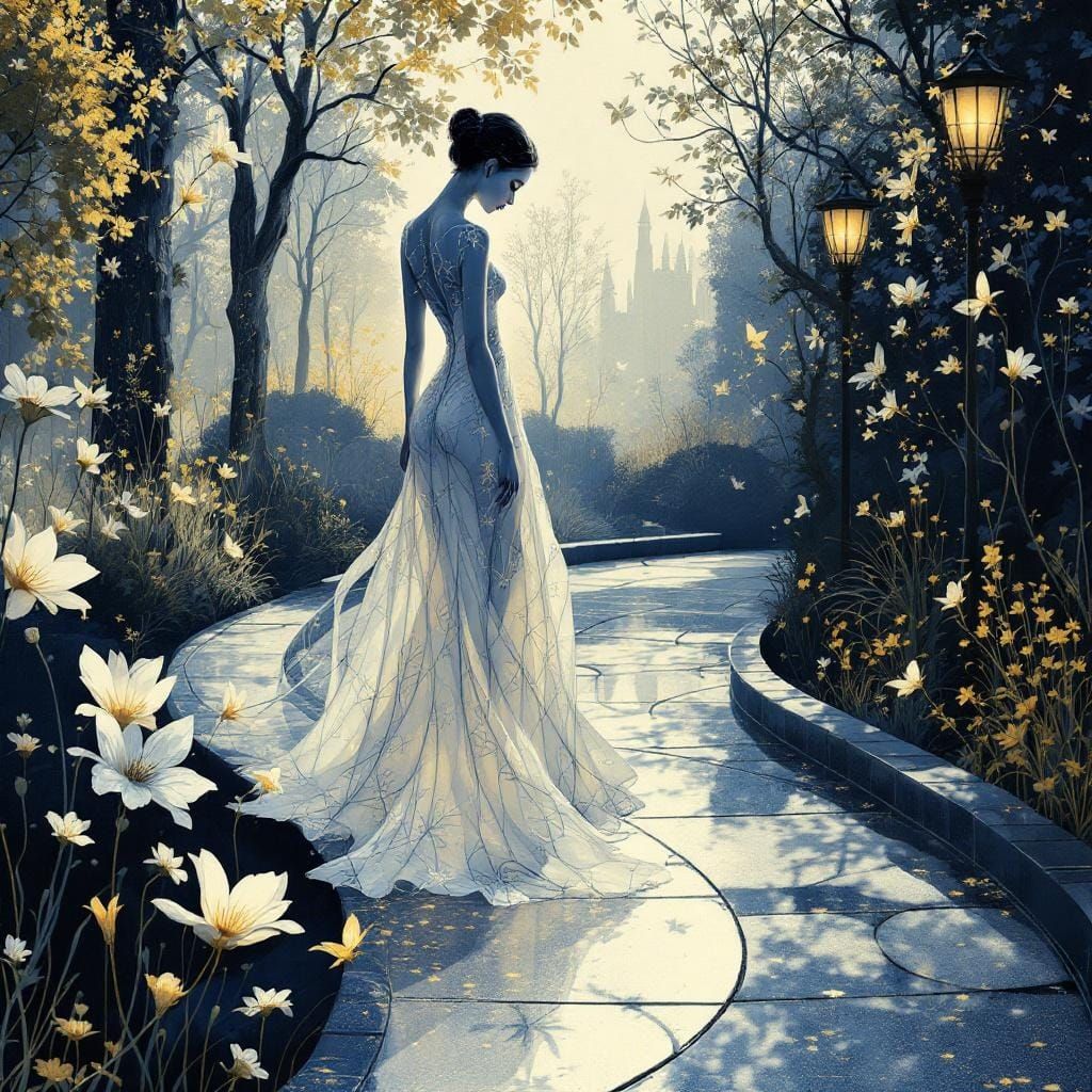 A mesmerizing image of a woman in an Art Nouveau style. It features ceramic-like skin and butterfly motifs, with luminous surfaces and precise silhouettes creating an ethereal and elegant aesthetic.