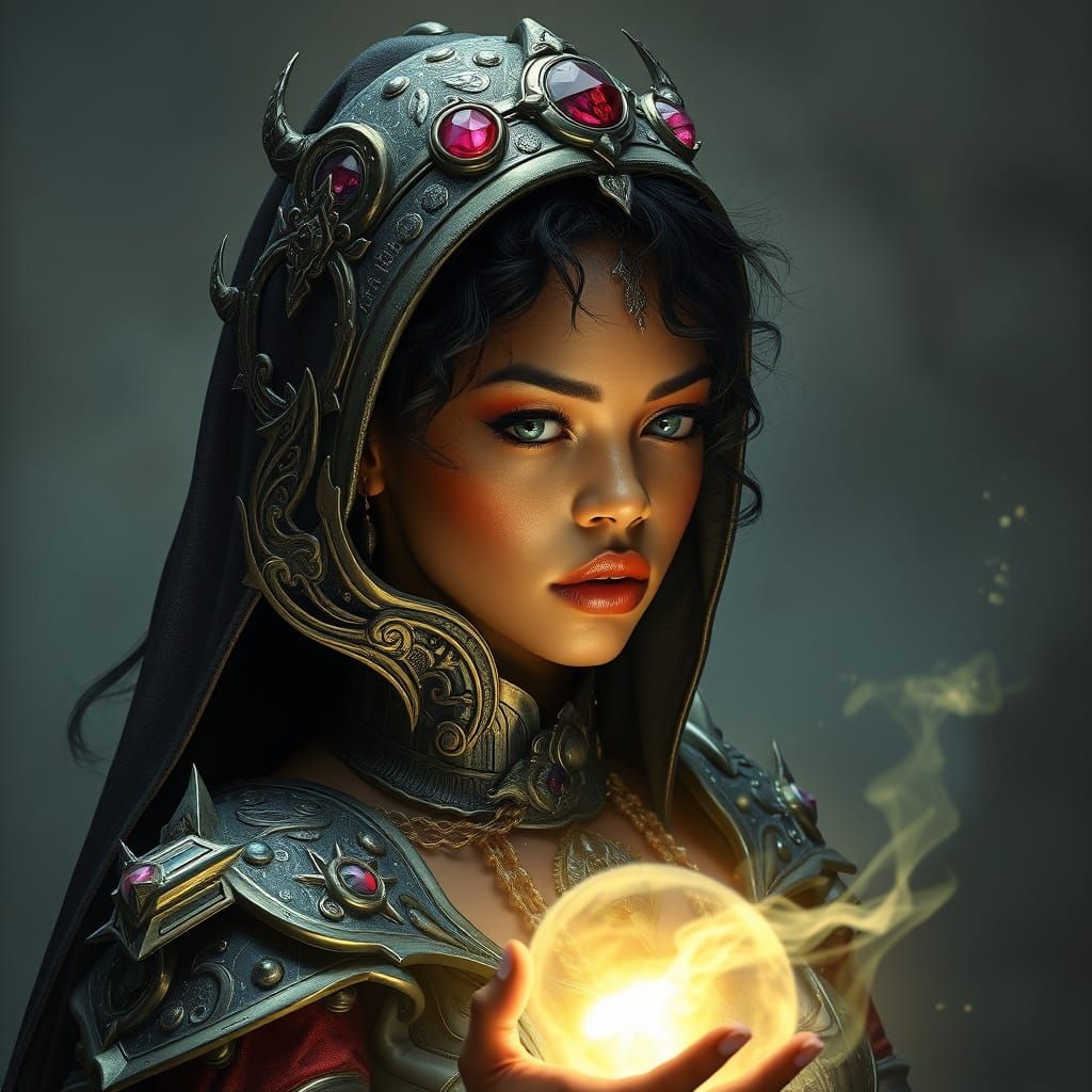 A photorealistic image of a woman with fantasy armor casting a spell. The image is reminiscent of digital fantasy art with ethereal glows and intricate details.
