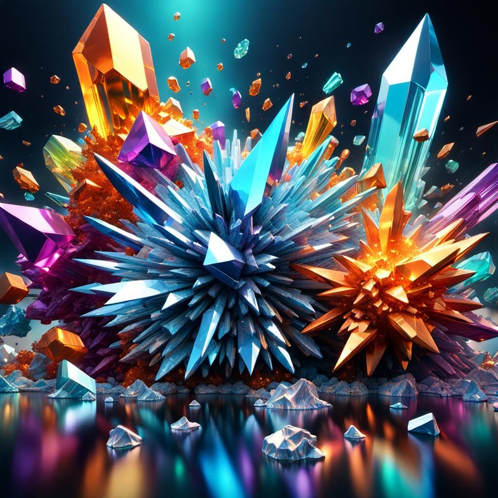 A vibrant image showing shards of crystal erupting outwards. The artwork features dynamic lighting, volumetric effects, and detailed 3D shading in a tetradic color scheme.
