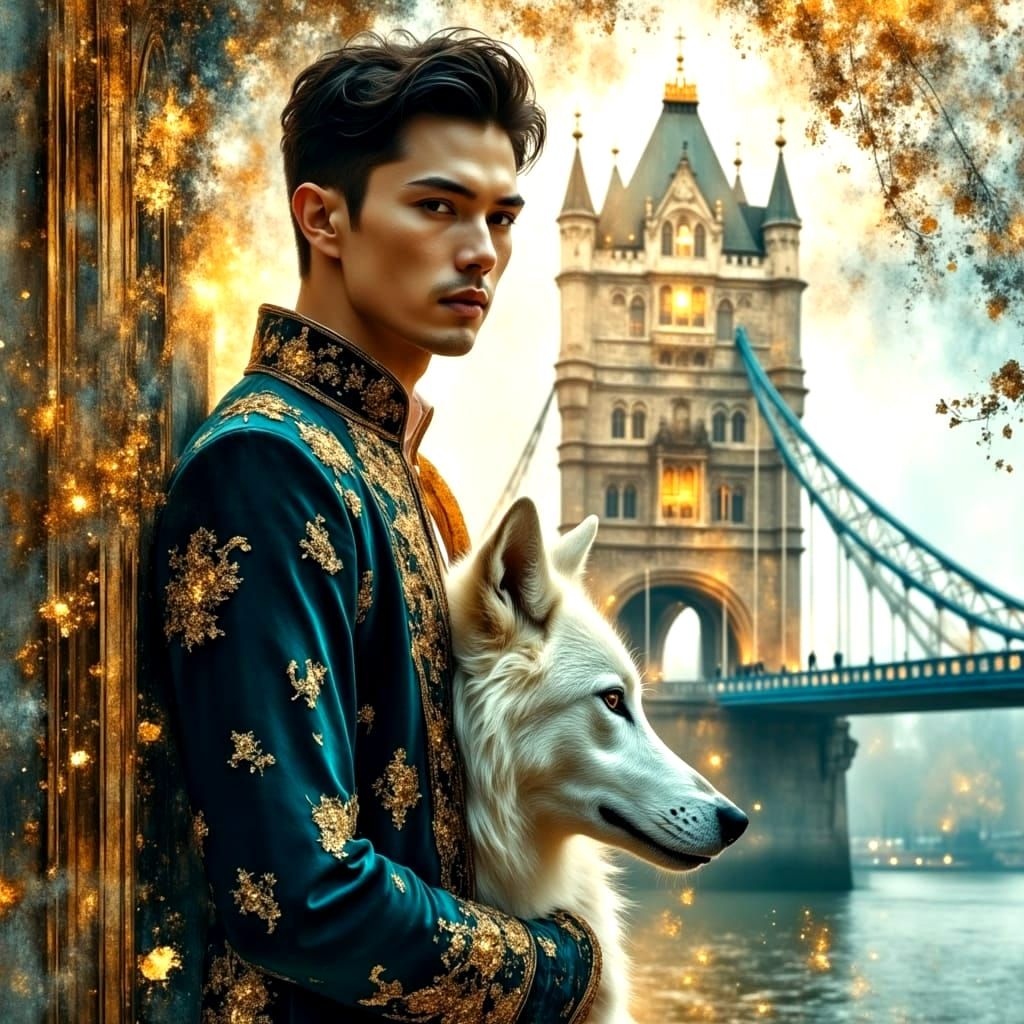 This image shows a beautiful scene of a man and a majestic white wolf standing together near the iconic Tower Bridge in London, set in a dreamy, ethereal atmosphere with intricate details and decorative ornamentation.