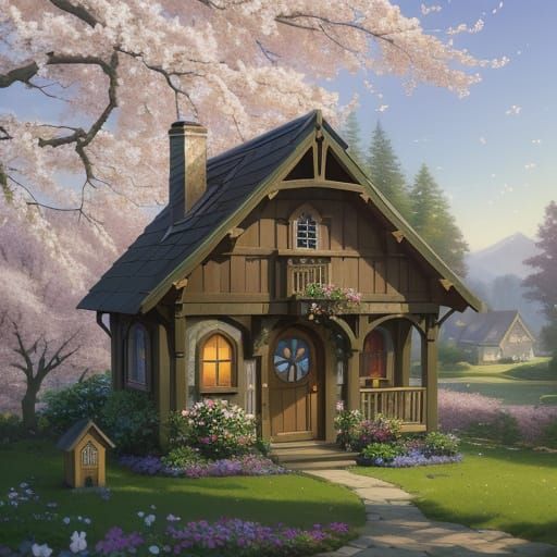This image shows a charming birdhouse cottage nestled in a cherry tree, alive with flowers and birds. Rendered as detailed matte fantasy art, the scene evokes peace and tranquility.