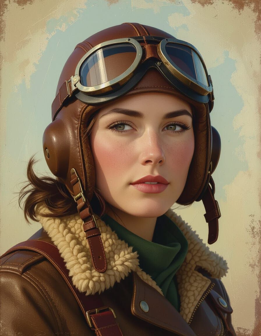 A striking picture of a female aviator in vintage attire, reminiscent of Amy Johnson. The portrait features side lighting, natural hues, dramatic color depth, and high-contrast details in a hyperrealistic style.