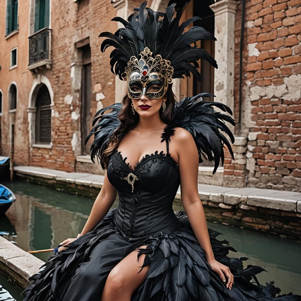 Stunning beautful brunette woman, massive big breast, dressed in black silk gown, wearing a venetian mask with black feathers.