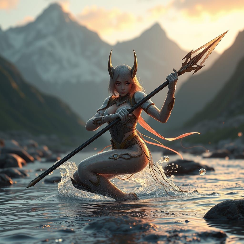 A striking image of a cybernetic warrior swimming in a mountain stream. She wears translucent armor and wields an energy spear, rendered as detailed 3D anime art.