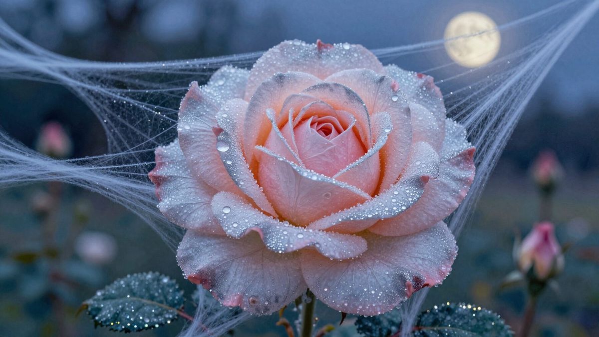 A delicate rose crafted from shimmering spider silk, with silver threads forming petals. The artwork is rendered with distinct dots of color, capturing a dreamlike twilight garden.