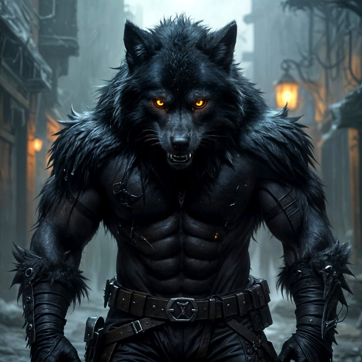 This image shows an aggressive black wolf depicted as a poster. The artwork features incredibly detailed realism with high contrast, reminiscent of dark and epic fantasy paintings.