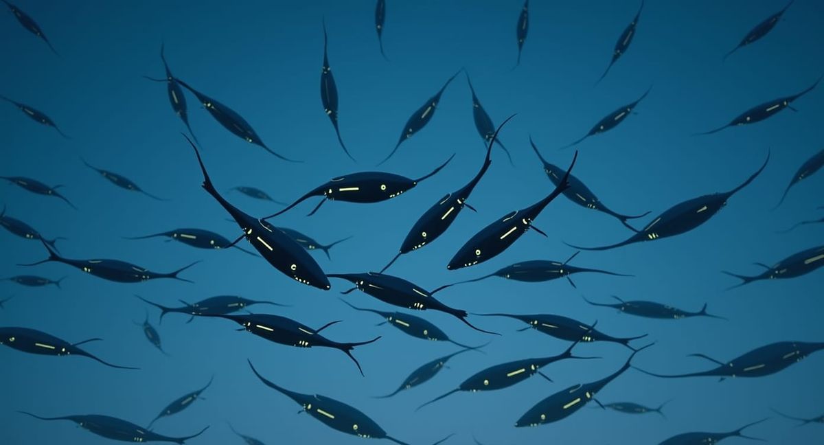 A cinematic image of thousands of electric eels soaring through a blue alien sky. Their dark bodies emit soft, glowing pulses as they migrate in formation through the serene atmosphere.