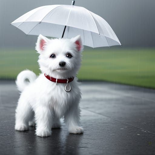 This image shows a beautiful little white dog holding an umbrella in the rain. The artwork is rendered in a hyper-realistic style.