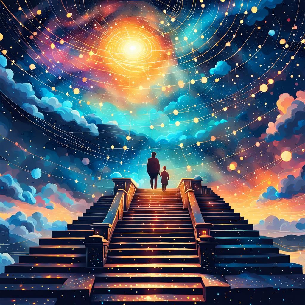 A close-up photograph shows a father and son on a staircase. The colorful sky with clouds is rendered as an abstract oil and pastel painting with lines and dots, in a fantasy style.