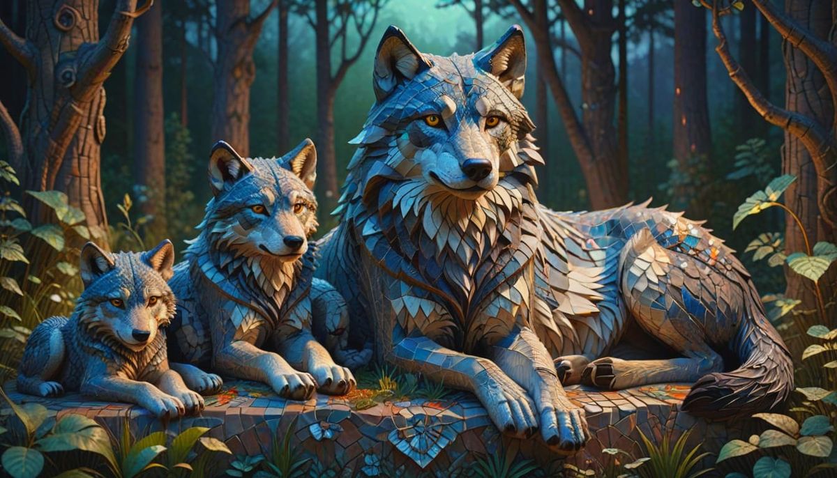 A hyperdetailed mosaic depicting a wolf and cubs at twilight, blending Art Deco and Art Nouveau styles with intricate 3D rendering.