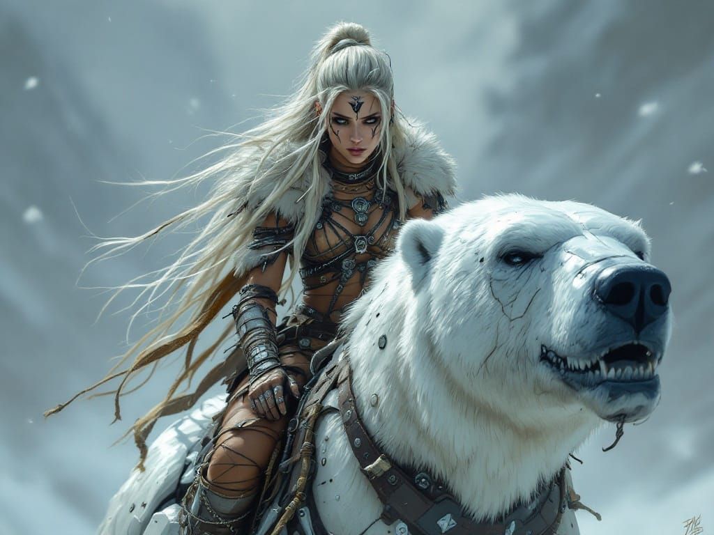 This image depicts a powerful female Viking warrior astride a robotic polar bear, clad in a simple yet striking war costume and adorned with tribal makeup, exuding confidence and determination in a gritty steampunk-inspired scene.