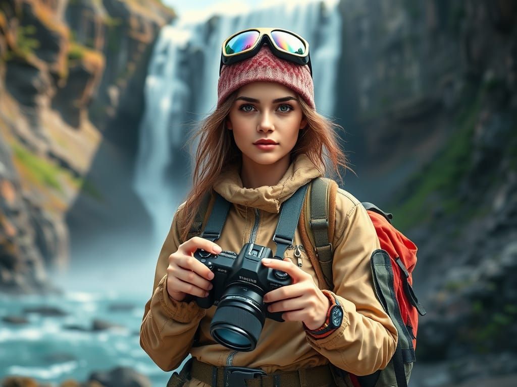 A striking portrait of a female photographer with a camera. The image features dynamic lighting, ornate patterns, and hyperdetailed textures against a stunning waterfall backdrop in a fantasy realism style.