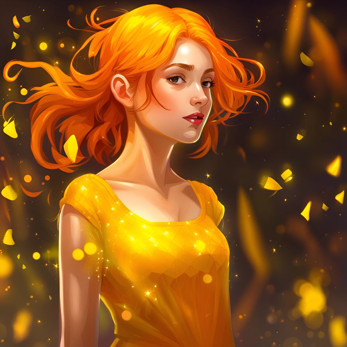 A vivid image features a girl with vibrant orange hair and a sparkling yellow dress. The scene is bathed in a bright, cheerful light.