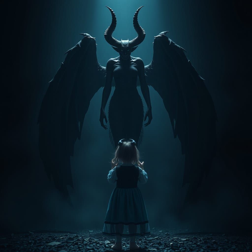 A striking picture of a tall, black demoness with horns and wings dominating a void. A small girl faces away from the viewer, seemingly awaiting her fate in a hyperrealistic, cinematic scene.