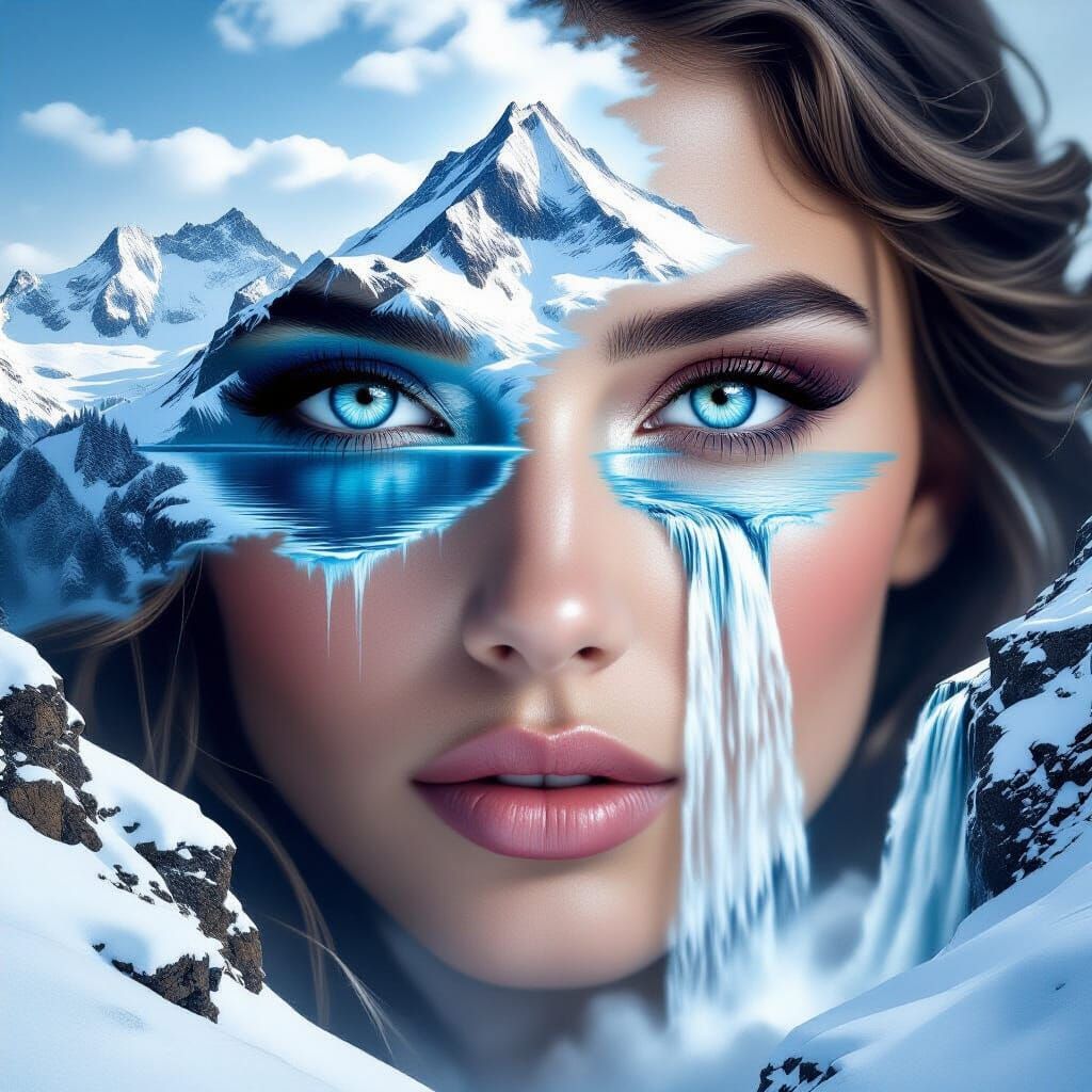 A snow capped mountain scene with a double exposure effect of a portrait of a beautiful woman with eyes that are pools of water, 3/4 camera angle, silhouette. There is a long waterfall in a double exposure effect flowing from her left eye and a double exposure effect of a long waterfall flowing from ...