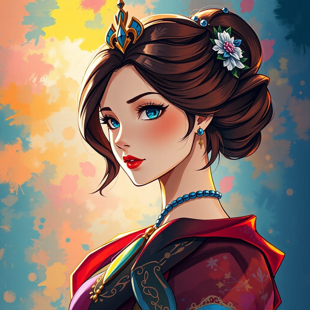 This Anime-inspired artwork features a detailed princess in mid-shot, with a dramatic side light, set against a colorful, layered background reminiscent of Impressionist masterpieces with thick brush strokes and vibrant gouache textures, blending Cel-Shaded Hyperrealism with cinematic lighting.