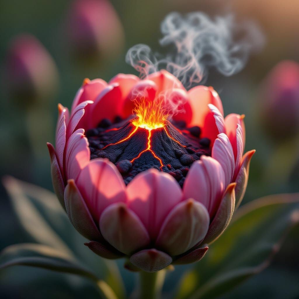 This image shows a macro view of a flower bud containing a miniature, erupting volcano. The surreal photograph highlights the contrast between the flower's soft petals and the volcano's fiery power.