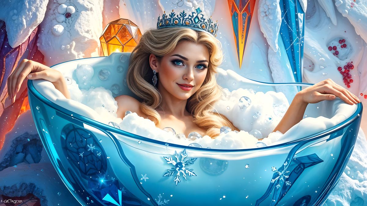 A digital painting of a blonde ice queen bathing in a crystal-adorned ice tub within a snowy landscape. The artwork features colorful crystals and icicles, rendered with hyperdetailed splash art and graffiti art elements.