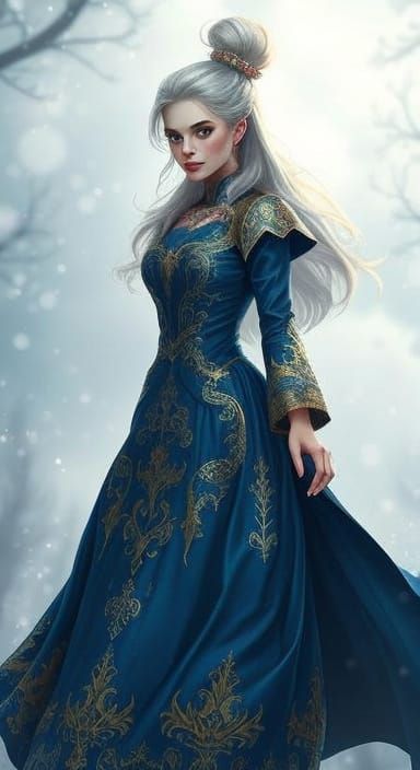 This image shows Zuri in a hallway, dressed in Victorian-era fantasy anime style. Her dress features gold accents and ice-blue glitter, with a long slit revealing her legs.