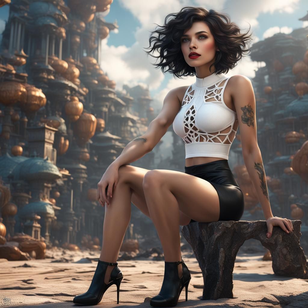 A digital painting of a curvy brunette in a white top and black bikini with heels. The image features intricate details and complementary colors, rendered in 8k resolution.