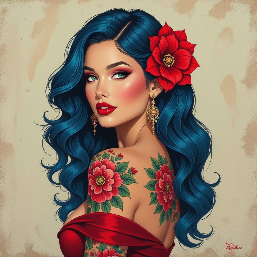 A vibrant portrait of a woman with blue hair and floral tattoos looking over her shoulder. The artwork features rich textures and bold colors in an expressionist style.