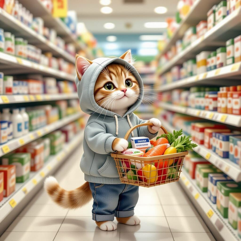 This image shows a cat standing like a human, shopping for groceries in a supermarket. The feline wears a hoodie and jeans while holding a basket with groceries, in a whimsical, illustrative style.
