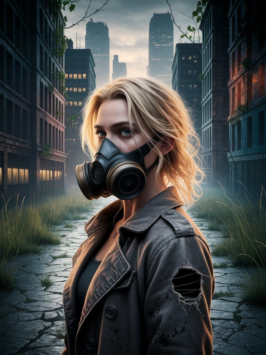 This image shows a blonde woman in a gas mask amidst a ruined cityscape. Dynamic lighting and triadic colors enhance the scene, rendered as hyperdetailed splash art.