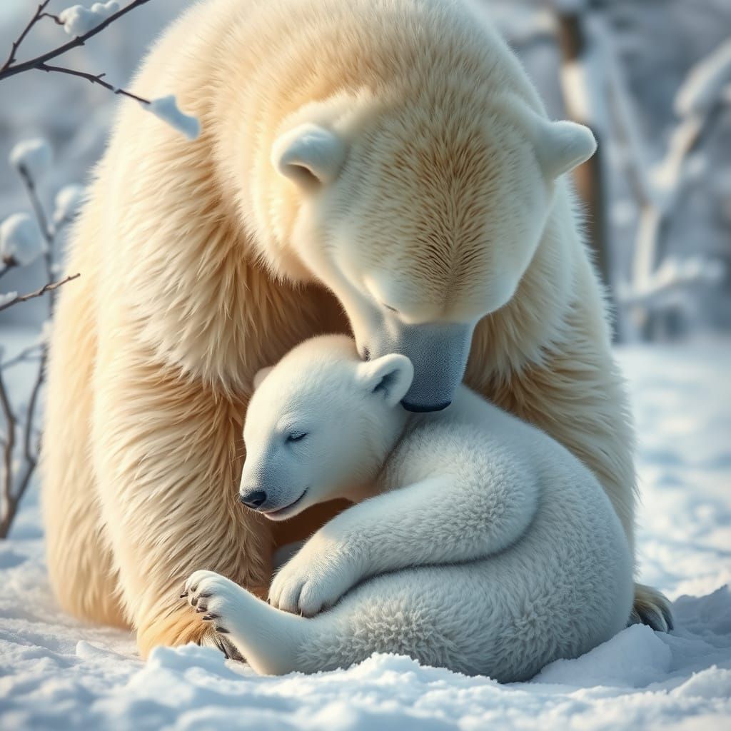 This image captures a heartwarming moment of a mother polar bear and her young one in a serene snowy environment, evoking feelings of tranquility and warmth.