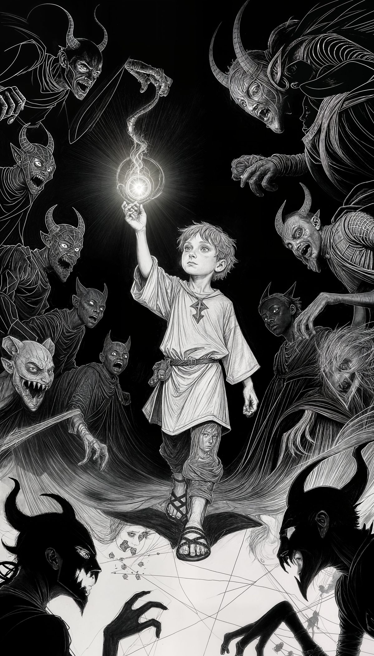 This image shows a child with a determined gaze holding a luminous light in a grim, dark setting. The art style features thin ink lines, crosshatching, and watercolor washes, reminiscent of Darkest Dungeon.