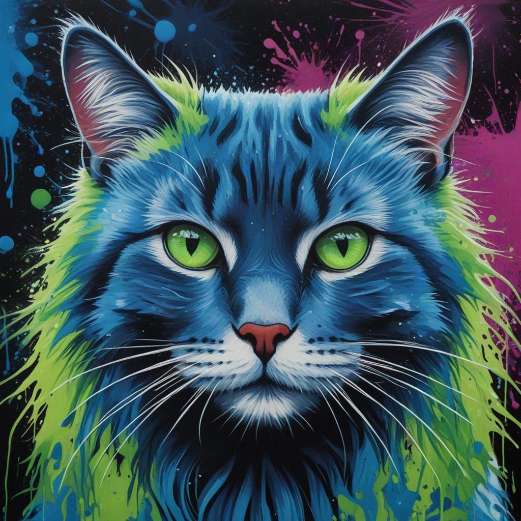 This image features a striking blue cat with piercing green eyes, rendered in a vibrant graffiti art style with spray-painted textures and bold color splashes.