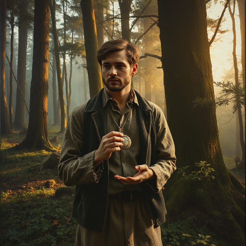 This image shows a man in vintage clothing holding an antique locket at the edge of an enchanted forest. The scene is rendered with dramatic shadows and soft light in an impasto painting style.