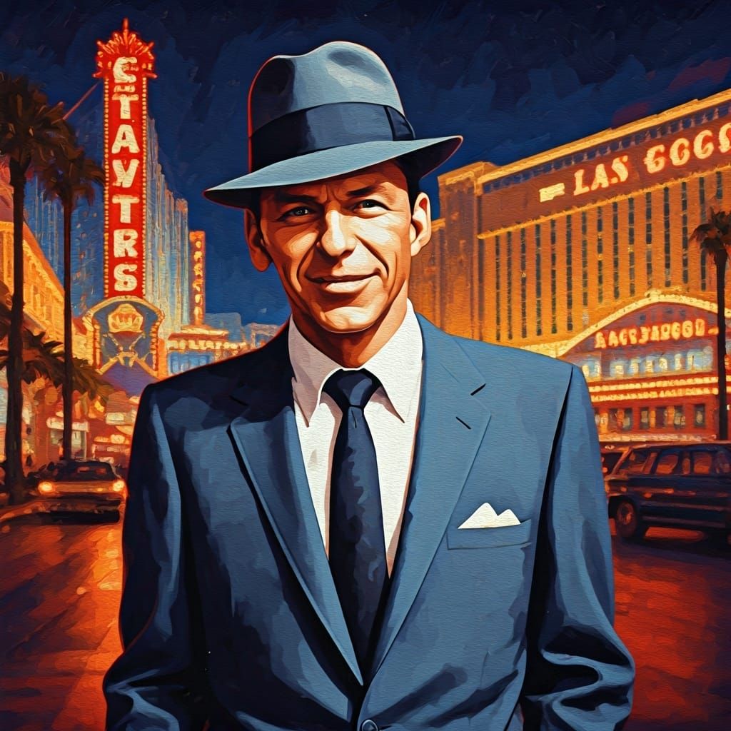 This image shows Frank Sinatra in a fedora and dark suit, casually strolling the Las Vegas strip at night. The oil painting captures a retro, colorful impressionistic style.