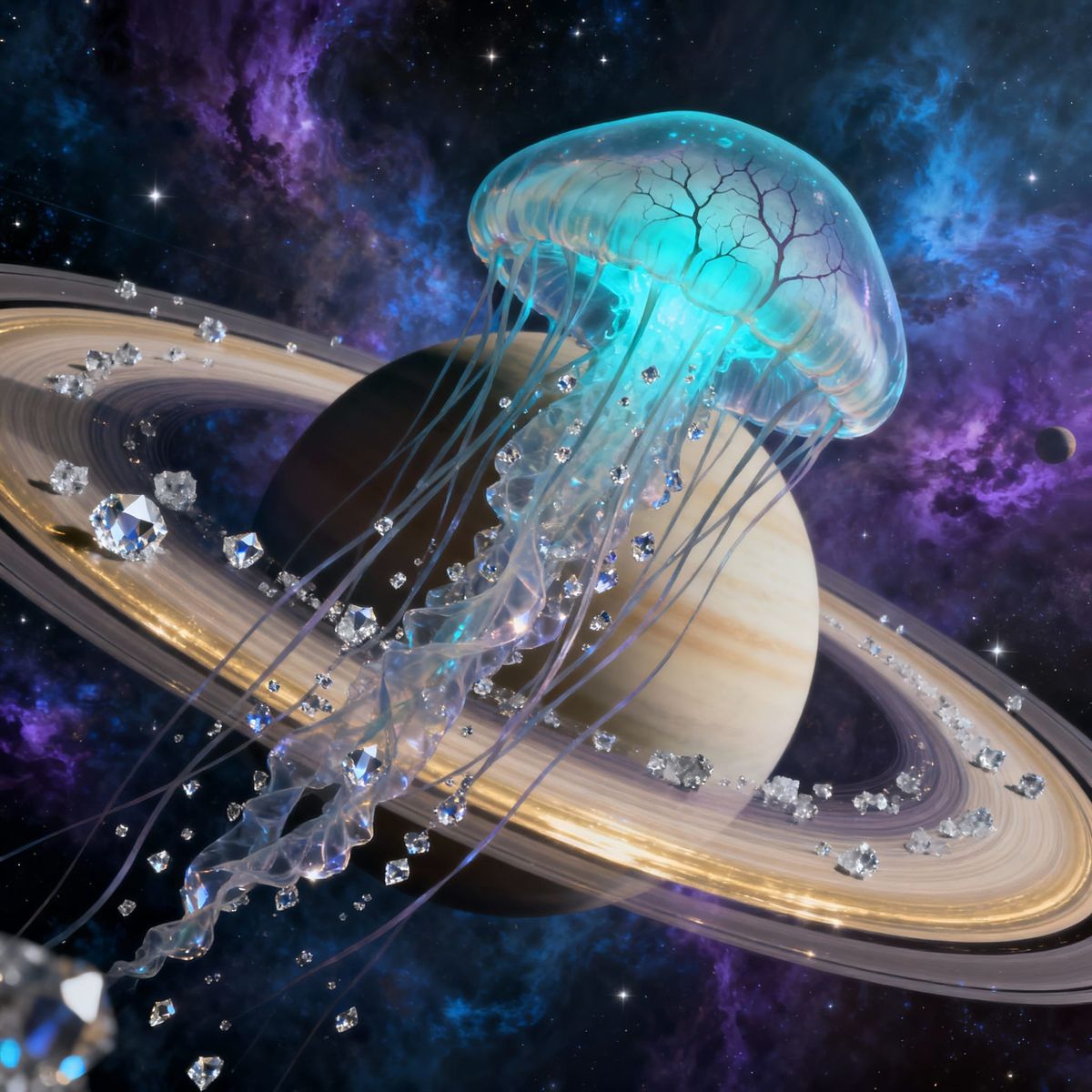 A colossal, glowing jellyfish floats through Saturn's icy rings, its tendrils interacting with cosmic dust. This surreal space scene captures immense scale and wonder.