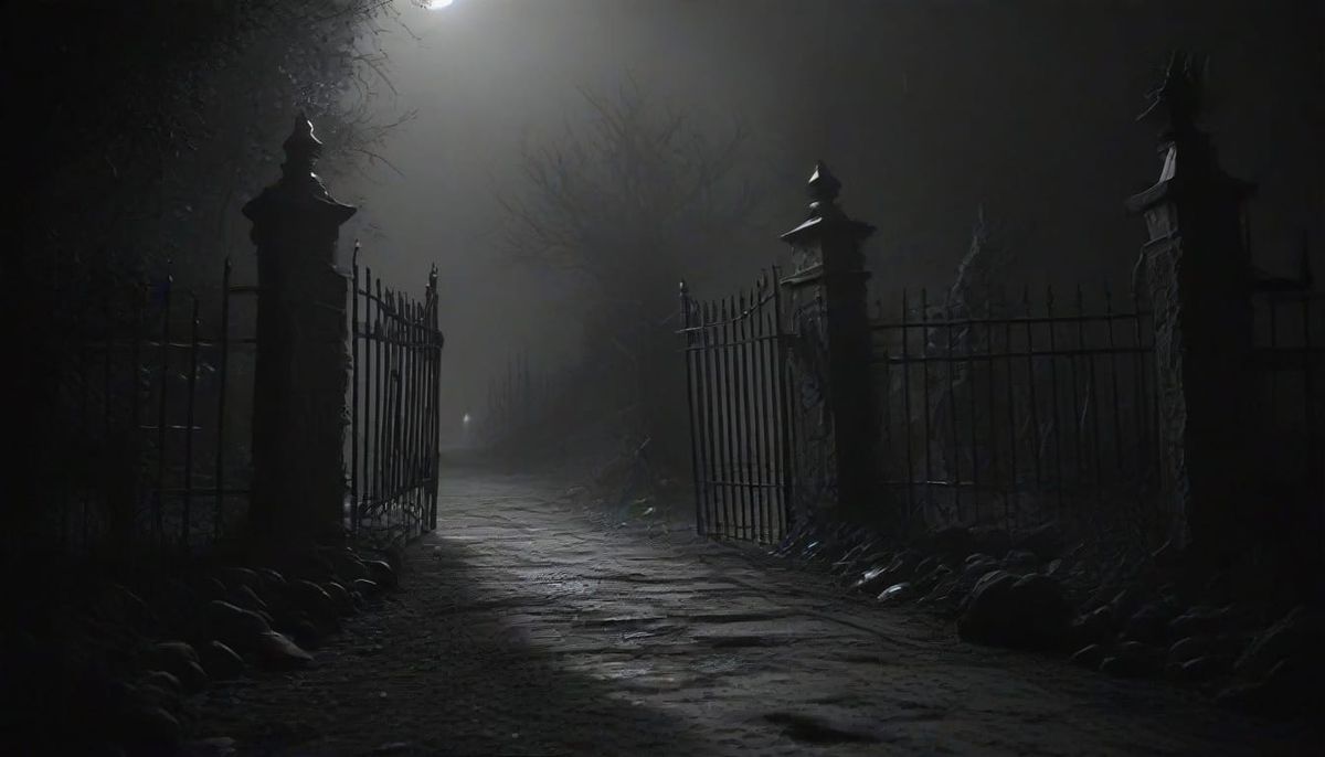 This image shows a haunting charcoal sketch of a dirt road descending into a fiery abyss. Strange creatures and flames line the path to a massive, ominous gate under a dark sky. The artwork captures a dark fantasy aesthetic with dramatic lighting and depth.