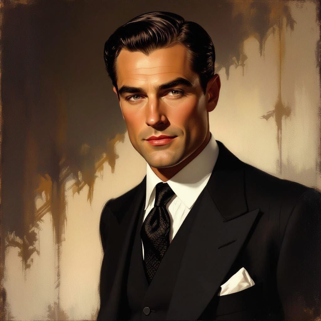 This image shows a distinguished profile portrait of Jay Gatsby, captured in a classic oil painting style. It features dramatic lighting and hyperrealistic detail, evoking mystery and opulence.