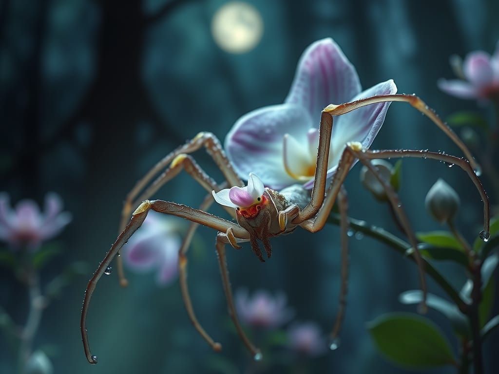 A captivating image of a spider-orchid hybrid in a moonlit forest. The surreal fusion features delicate petals and intricate legs, enhanced by soft, ethereal light in a photorealistic style.
