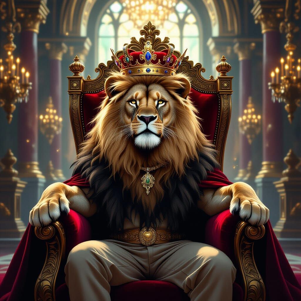 This image shows a majestic lion wearing a crown and sitting on a throne. The artwork features rich details, dramatic lighting, and subtle magical effects in a surreal fantasy art style.
