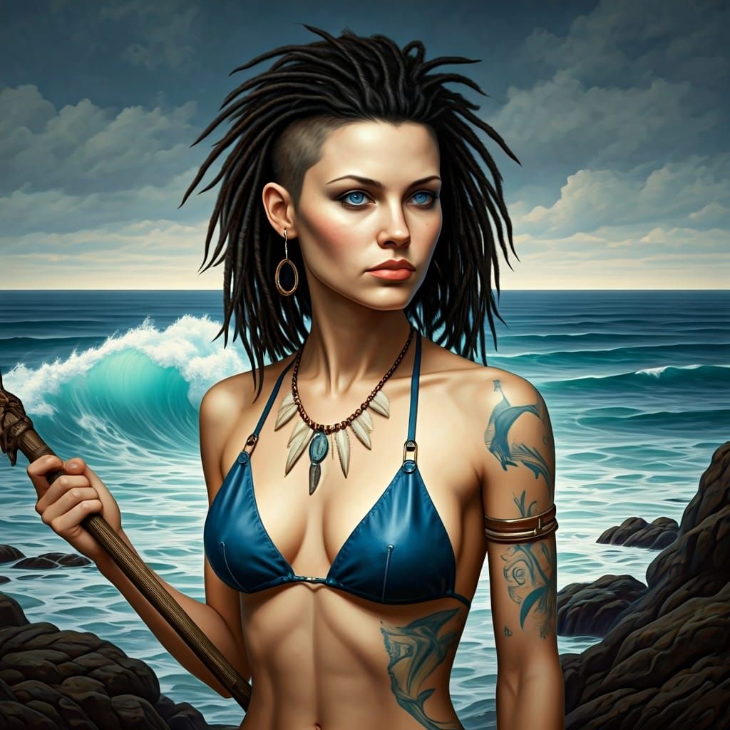 A striking picture of a young woman with dreadlocks and blue eyes, wearing a blue bikini and holding a spear. She has a dolphin tattoo and stands before rocky sea waves, in an oil painting style.