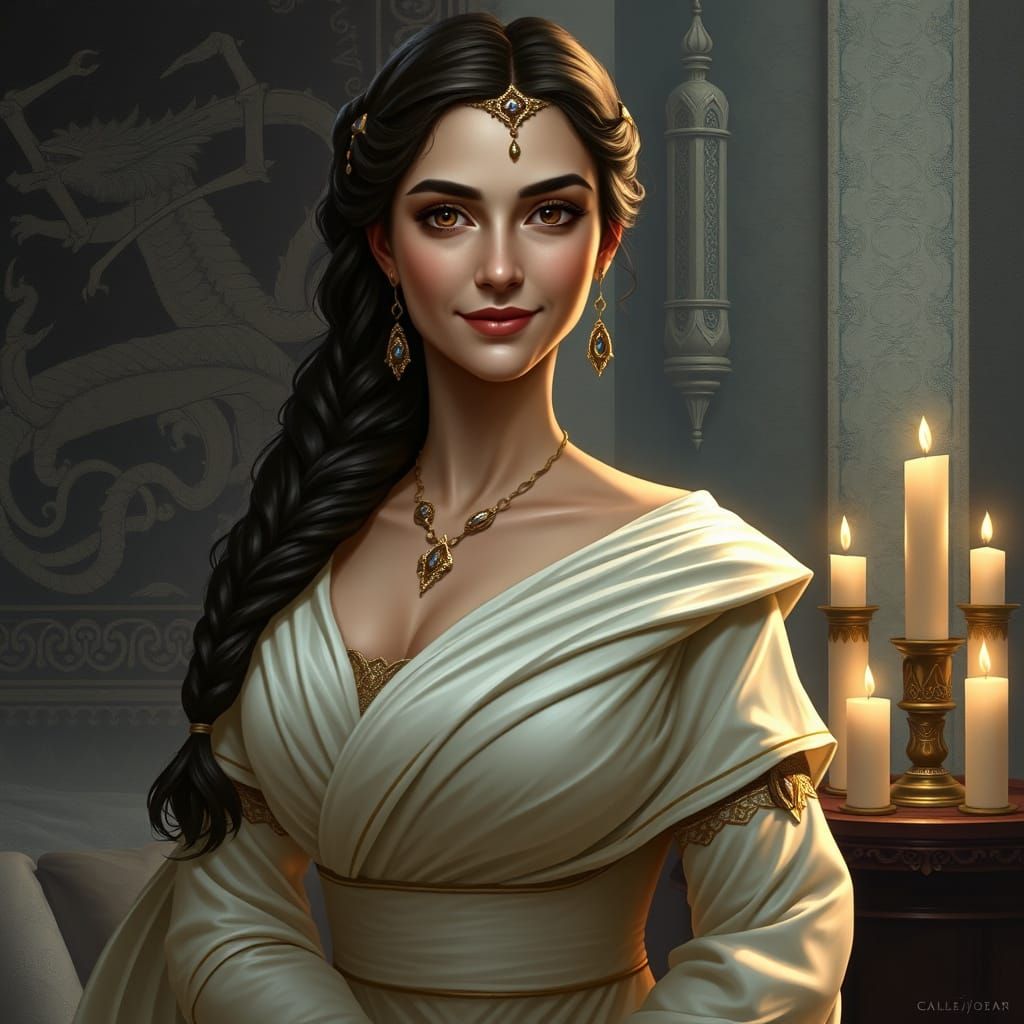 This image depicts a serene and enigmatic figure, blending regal elegance with subtle hints of intrigue. Delicate fabrics, intricate braids, and regal whites and golds evoke an atmosphere of imperial grandeur.