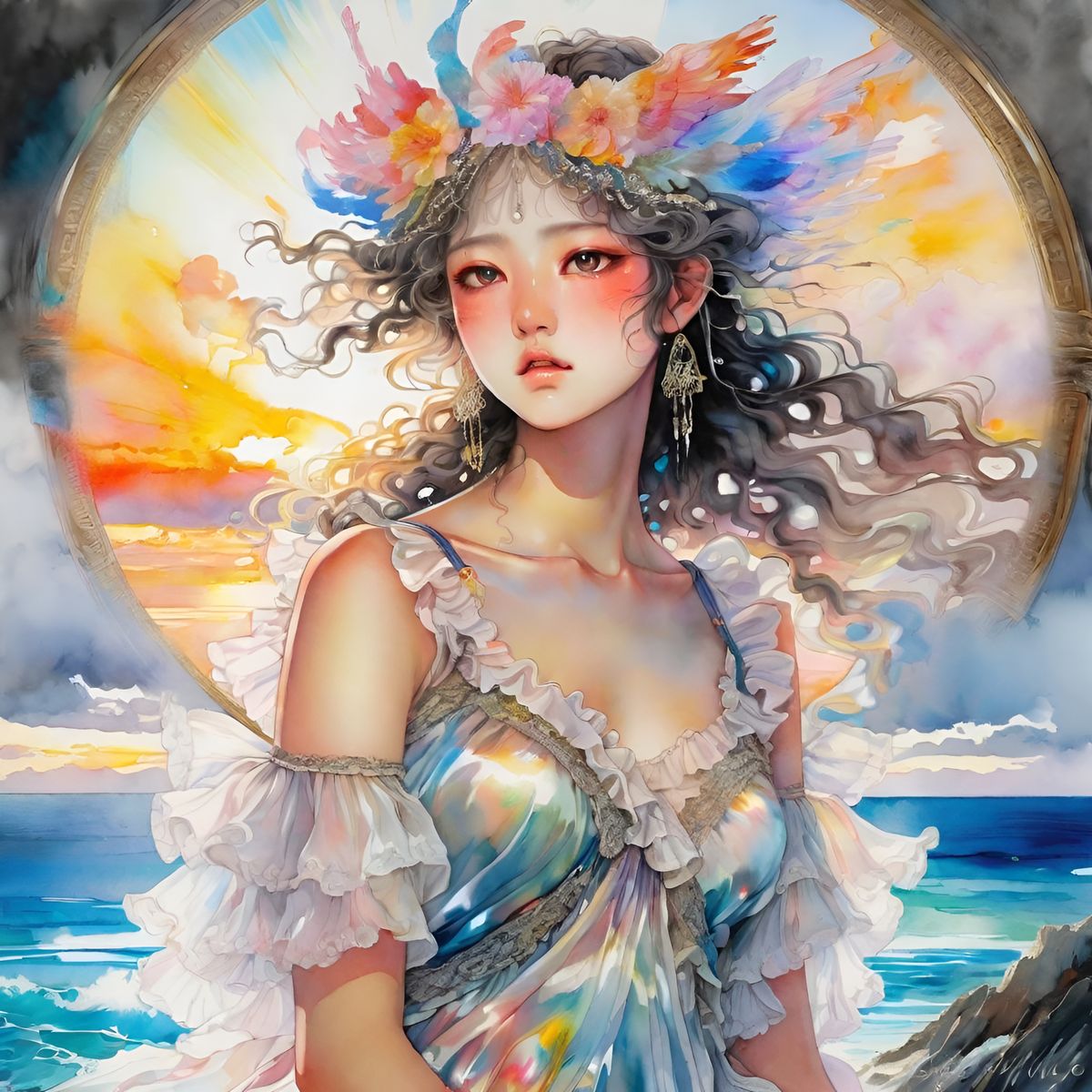 A digital rendering of a beautiful Greek goddess in an ornate dress. This image features painterly shading, clear coat imagery and a dark fantasy aesthetic reminiscent of 80s anime.